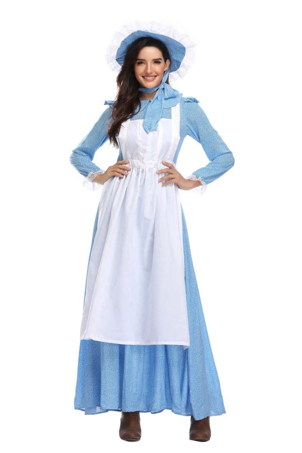 | Description: | Peter pan collar, the ruffle detail on the shoulder, long sleeve with the lace cuff, the floral pattern throughout, blue maxi length dress matching with a white apron and ruffle trim hat shaping a village maid image. |